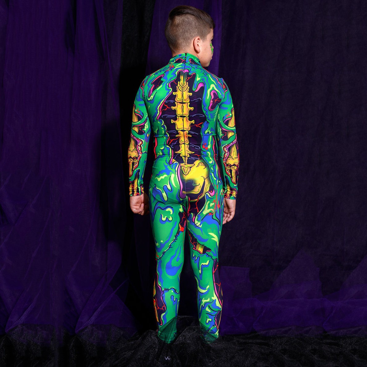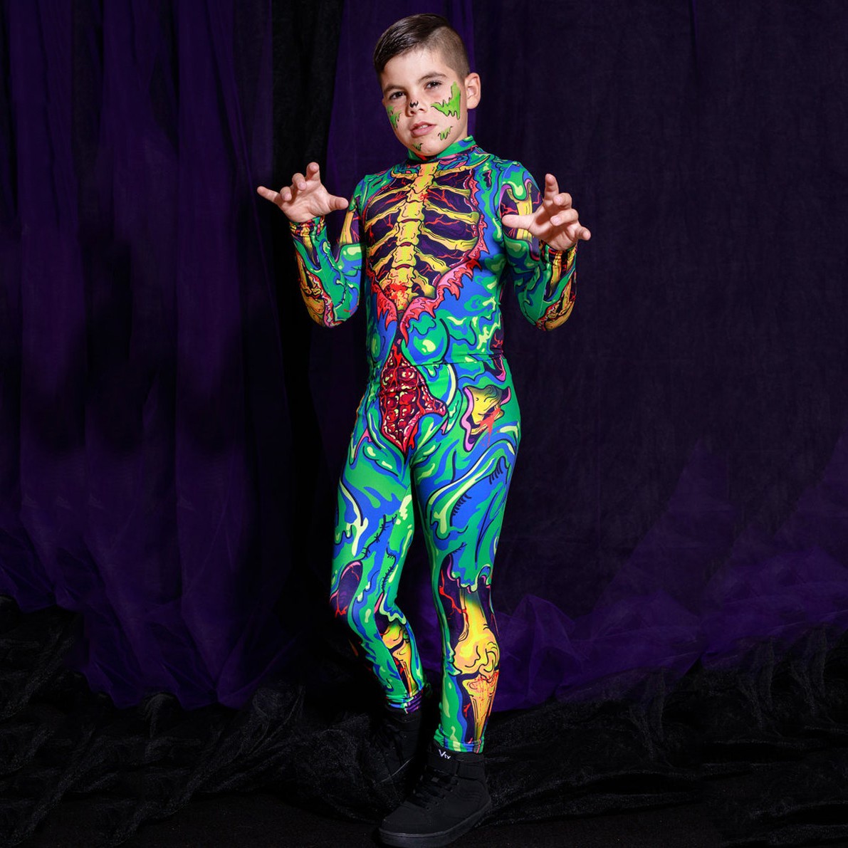 Embrace the macabre with this gruesome Halloween costume, featuring a print of bones and intestines all over. The snug fit and long sleeves, along with the mock neckline, will help your child embody the role of a savage brain-eater, striking fear into the hearts of all who see them. Get into the spirit of Halloween and let your child fully embrace the morbidity of life.