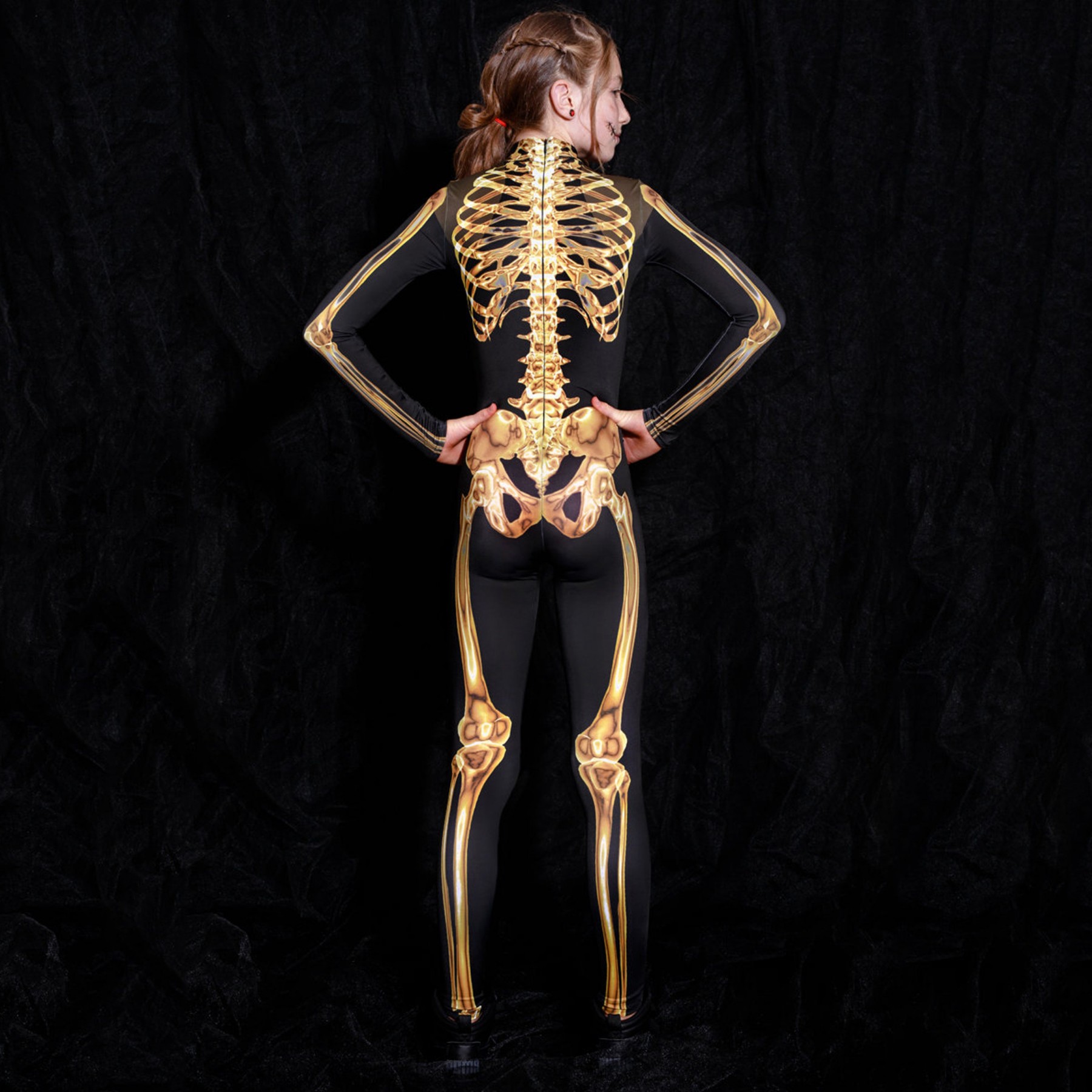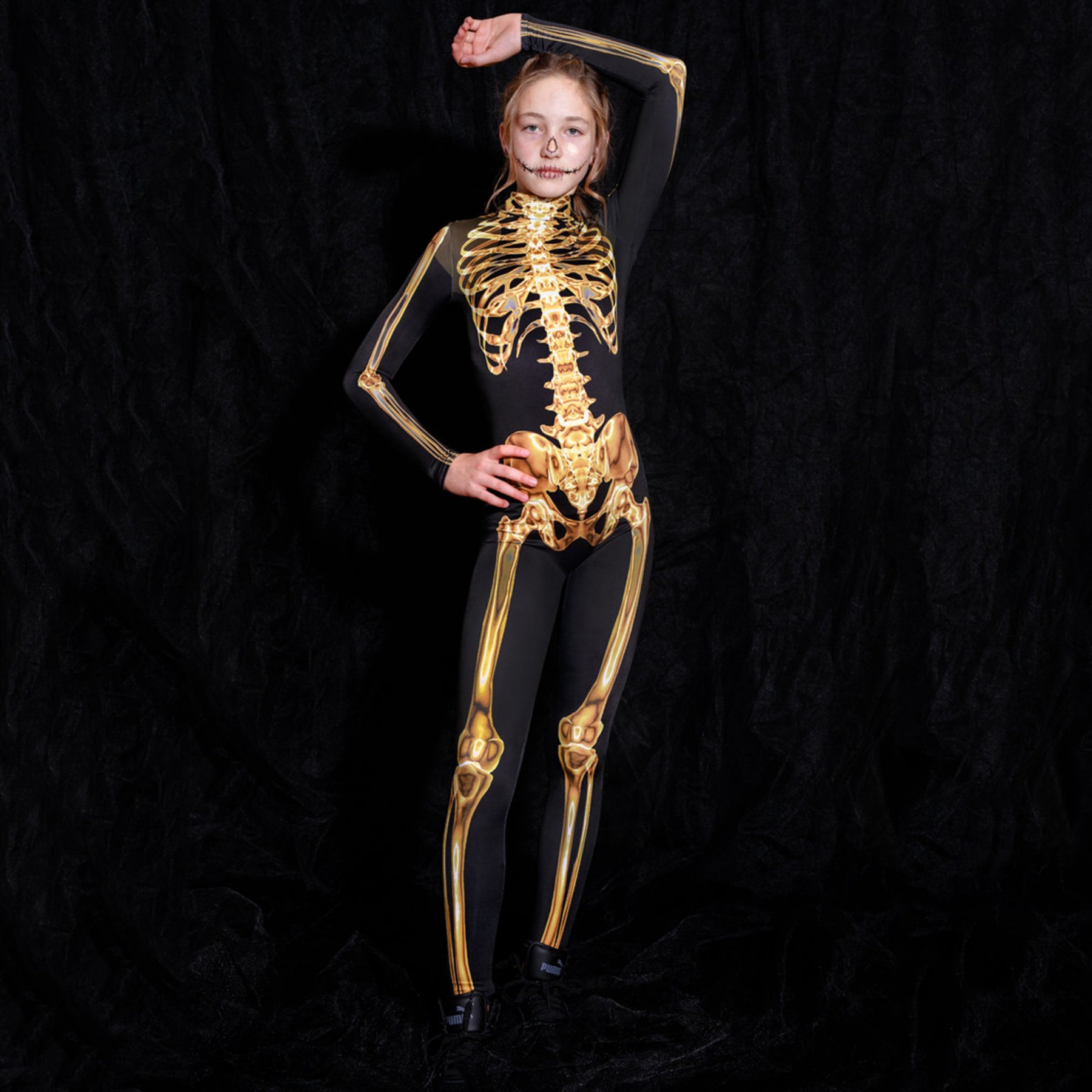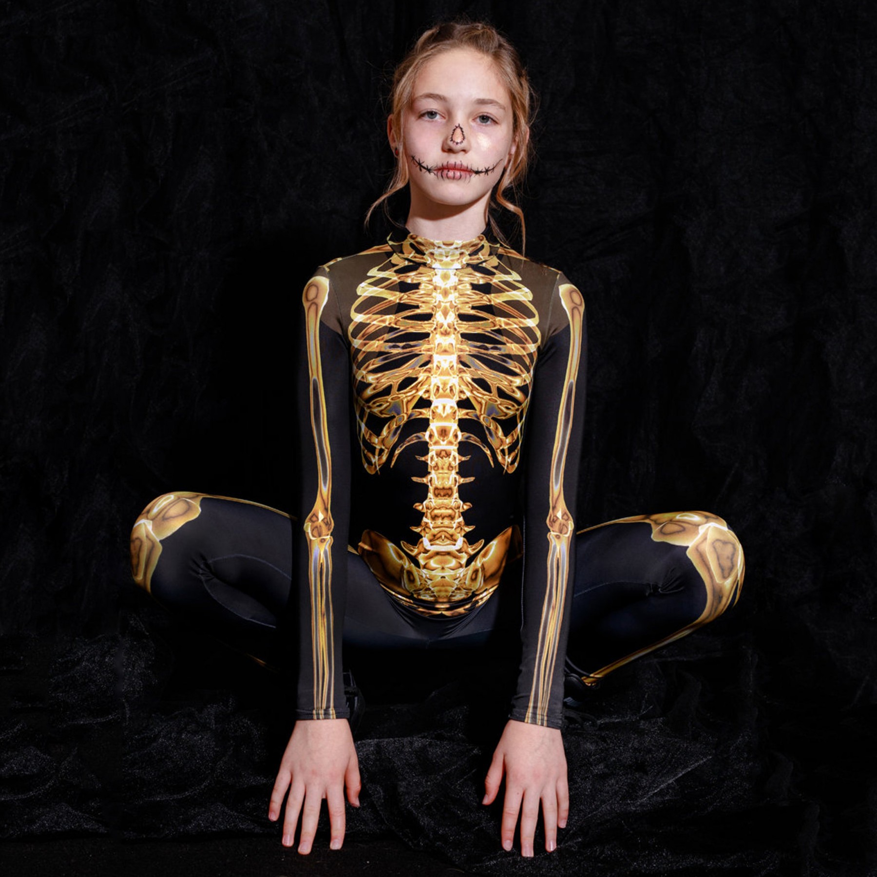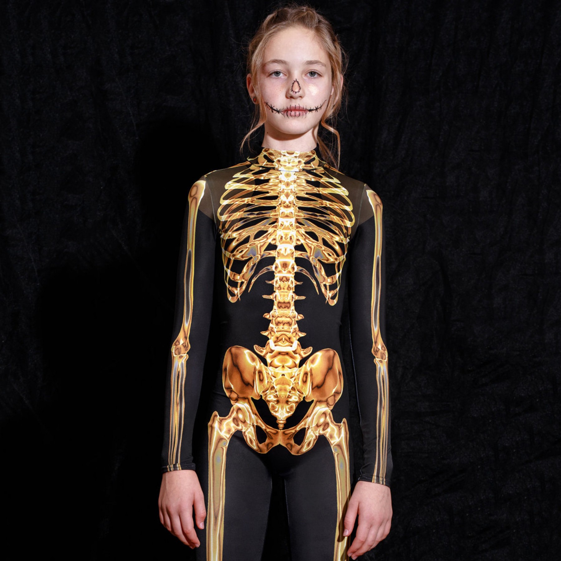 Make a lasting impression on Halloween with this mesmerizing children's costume featuring a golden skeleton print on a pitch-black background. The costume is designed to be comfortable, flexible, and perfect for children who like to party hard. Your child will be the center of attention and make those bones sing with festive cheer!