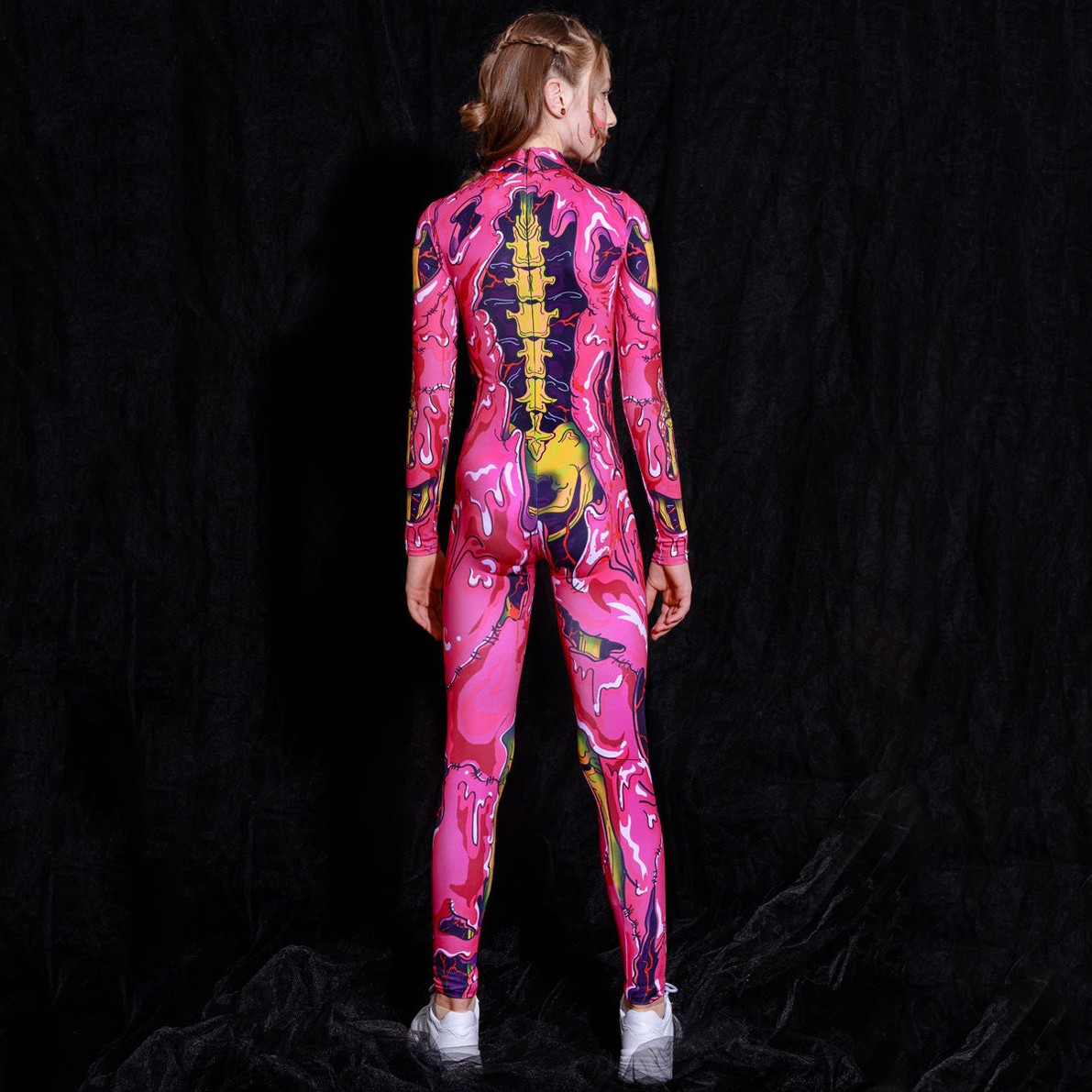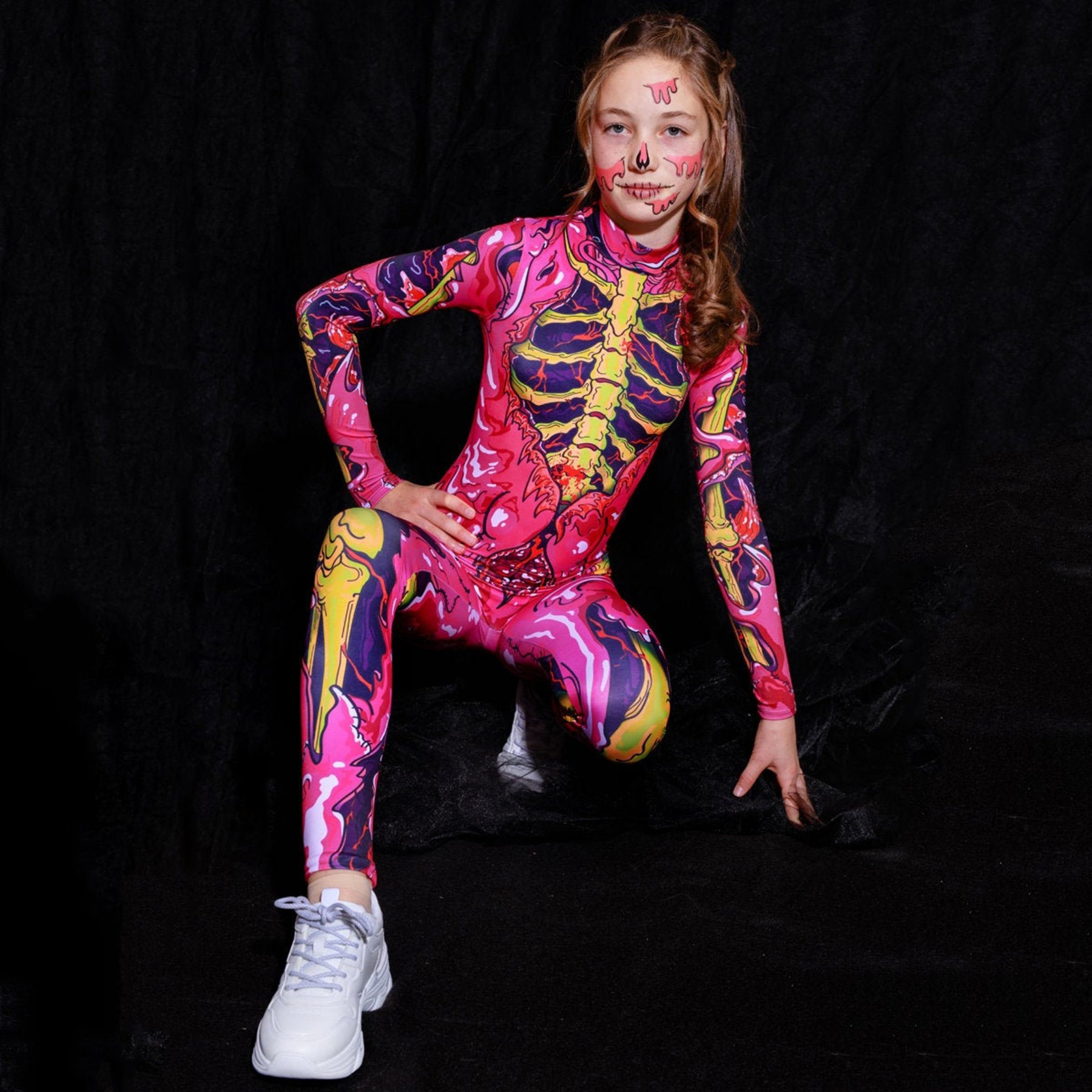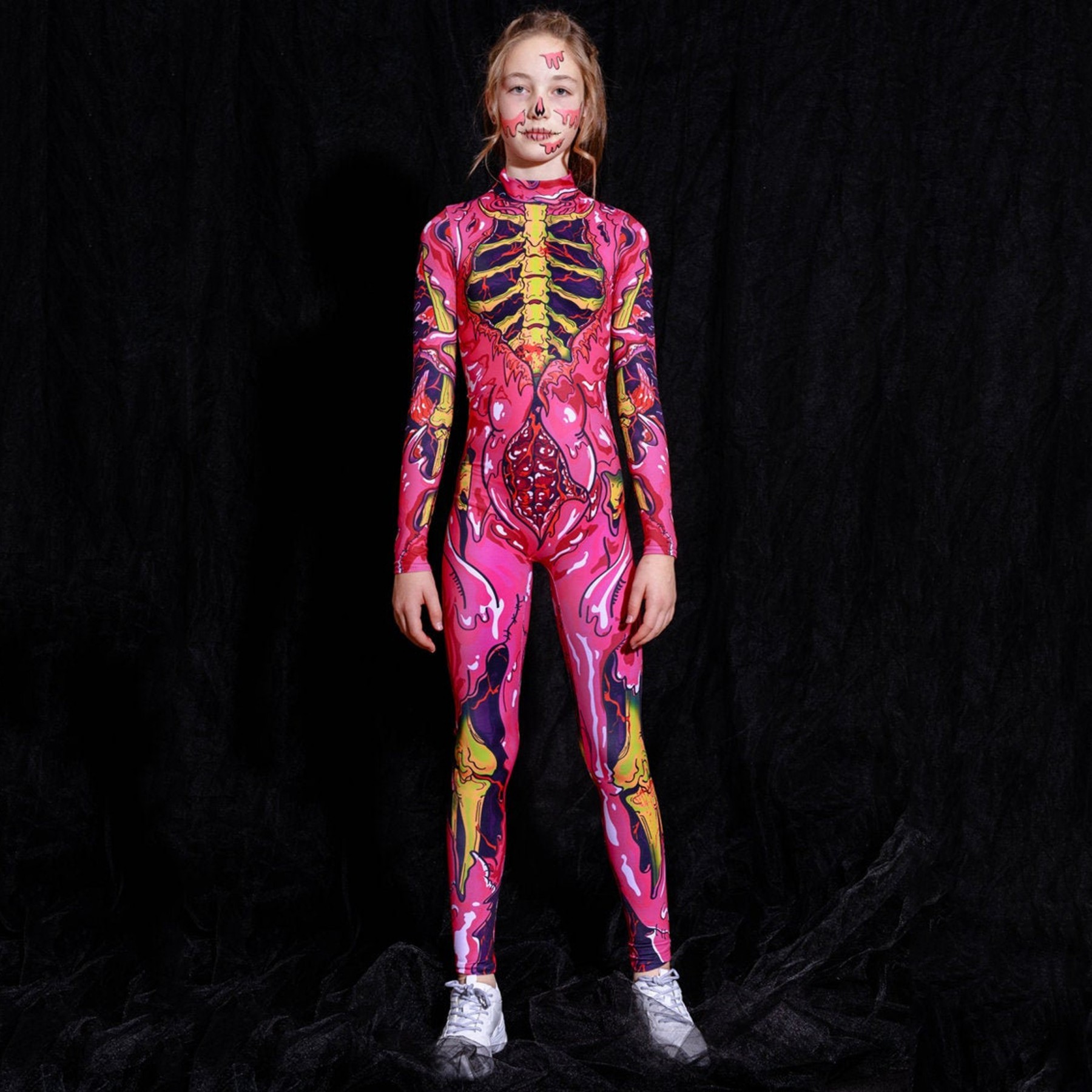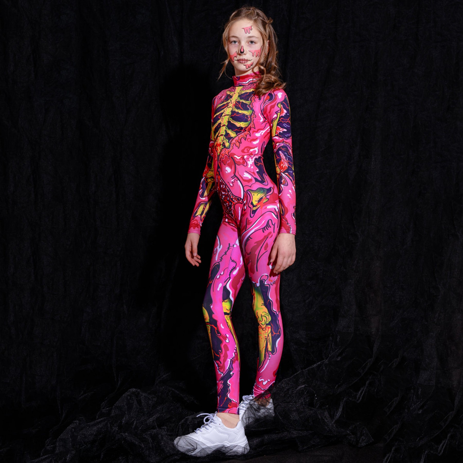 Make a statement with this terrifying Halloween costume for kids, featuring a pink and bloody design with bones on the chest and back. The stretchy material, long sleeves, and mock neckline make it comfortable to wear. The hidden back zip makes it easy to put on and take off, but there's no hiding from the fear this costume will instill.