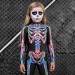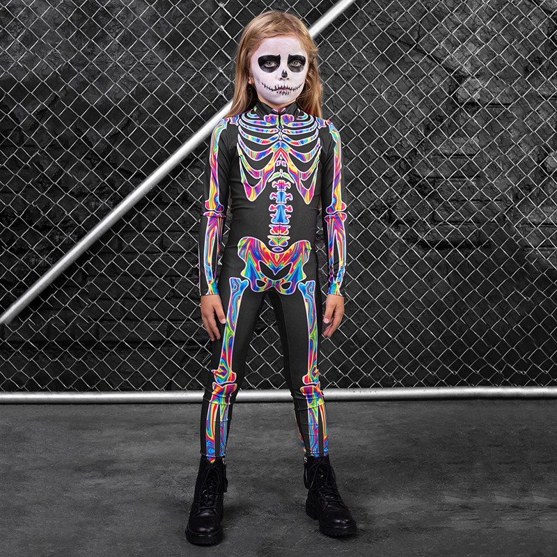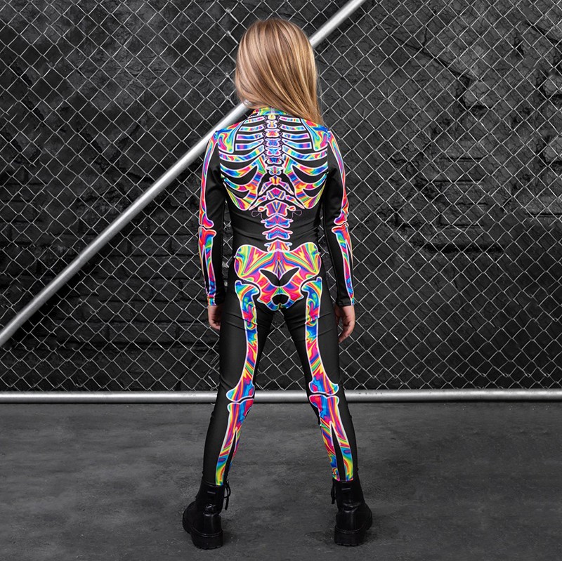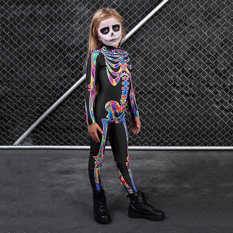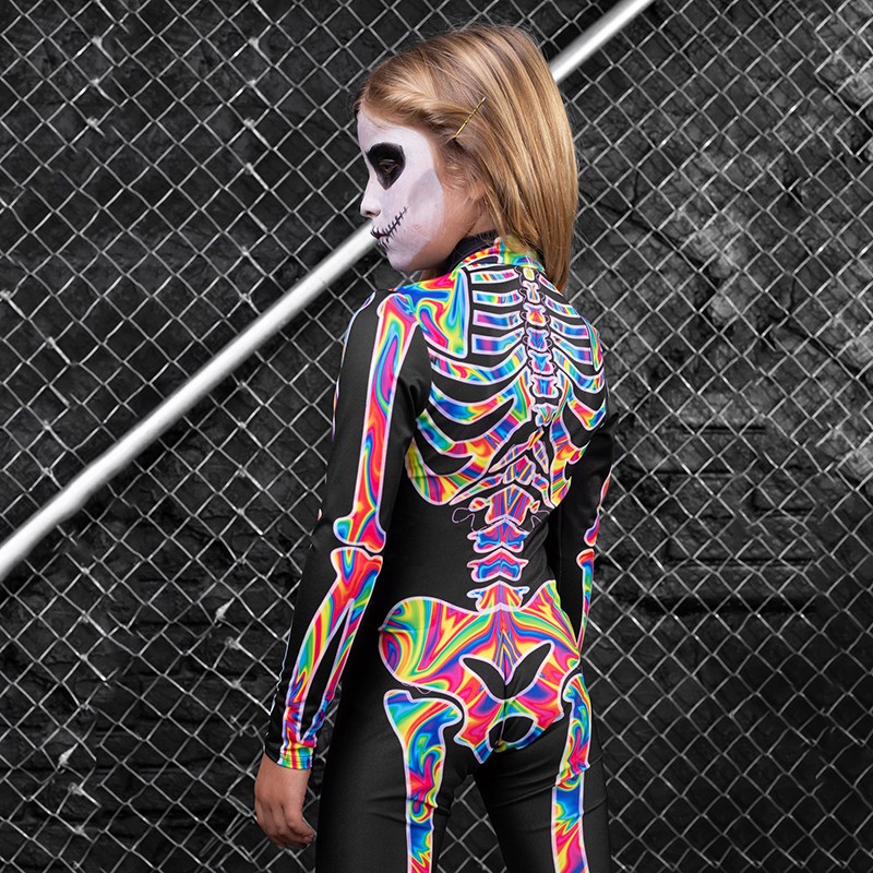 Make a lasting impression on Halloween with this mesmerizing children's costume featuring a rainbow skeleton print on a pitch-black background. The costume is designed to be comfortable, flexible, and perfect for children who like to party hard. Your child will be the center of attention and make those bones sing with festive cheer!