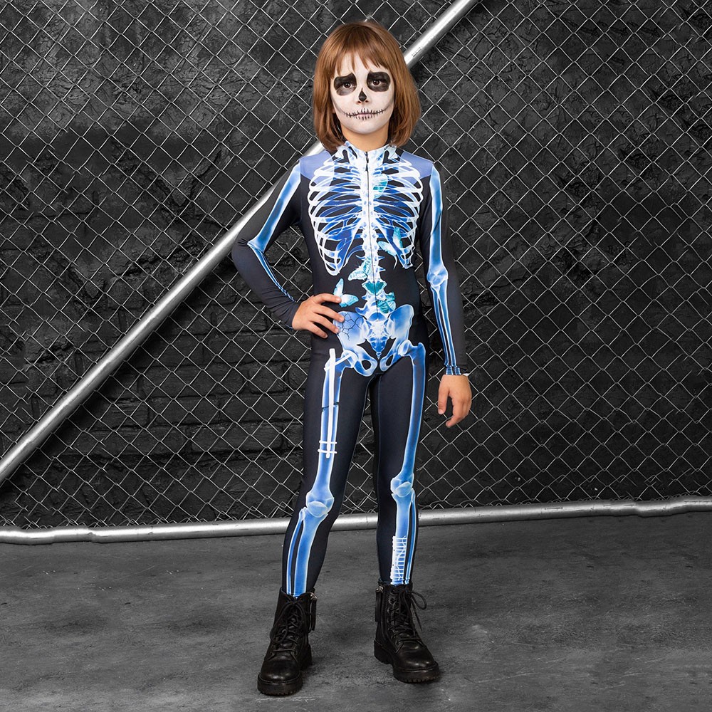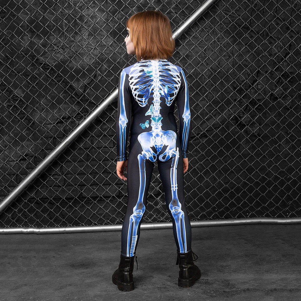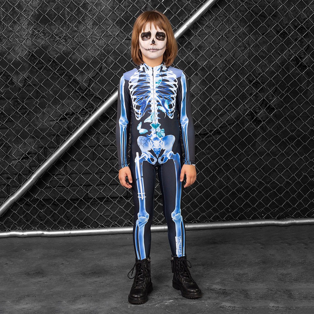 Make a lasting impression on Halloween with this mesmerizing children's costume featuring a skeleton print on a pitch-black background. The costume is designed to be comfortable, flexible, and perfect for children who like to party hard. Your child will be the center of attention and make those bones sing with festive cheer!