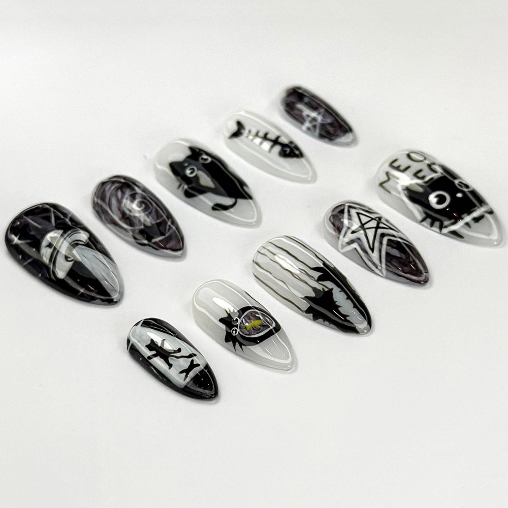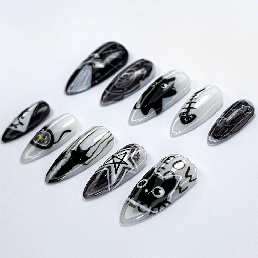 Dive into the bizarre and beautiful with these hand-painted press-on nails inspired by alien cats, dark magic, and intergalactic mystery. A perfect mix of spooky, adorable, and surreal, this set is made for those who embrace the weird and wonderful.